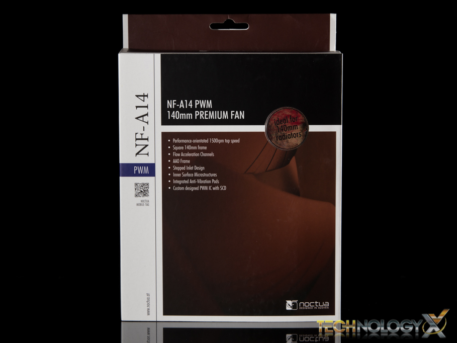 Taking a look at the exterior of the packaging, the front shows us Noctua’s simple marketing design with a quick artistic glance of the cooler in the background, followed by all the pertinent details of the cooler in the foreground.