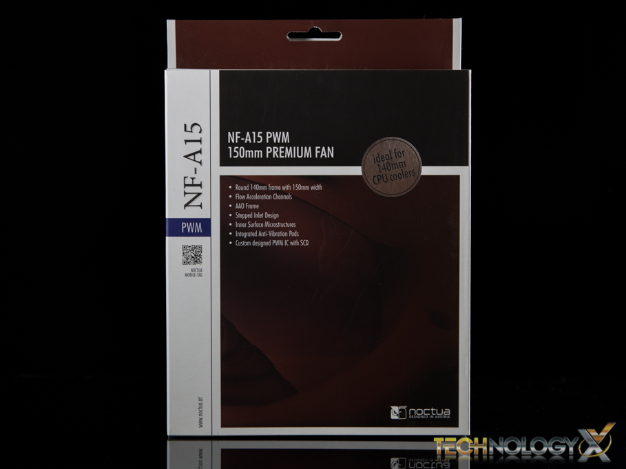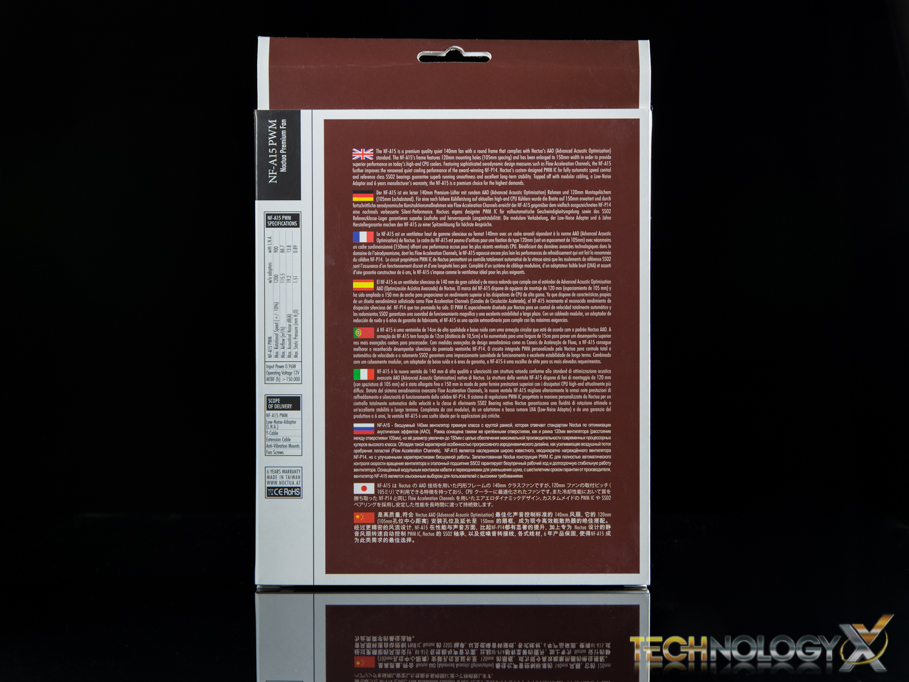 Taking a look at the front of the packaging, Noctua’s simple design gives us that iconic quick artistic glance of the cooler in the background, followed by quick details of the cooler in the foreground.