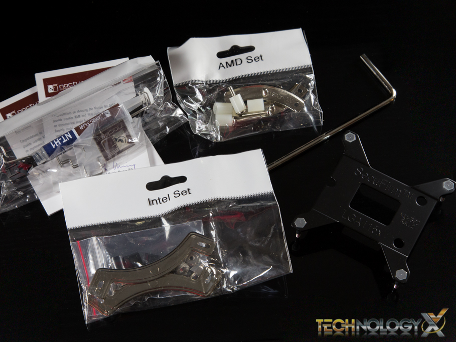 For accessories, Noctua provides you with the Intel and AMD installation sets packaged separately in clear plastic bags, a set of installation manuals, and a backplate for Intel 115x motherboards. You will also find the low-noise adapter for the fan which changes its maximum RPM from 1200 down to 900, as well as a 4-pin PWM y-splitter for powering a second fan. Noctua also includes their signature Noctua case badge, a tube of Noctua’s NT-H1 thermal compound and a Phillips head screwdriver to help with installation.