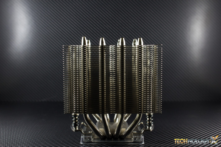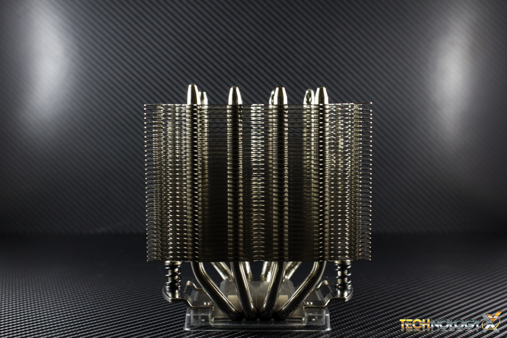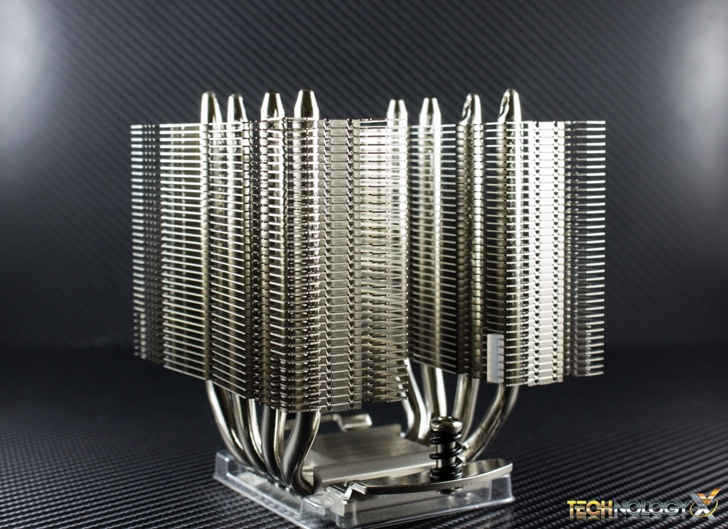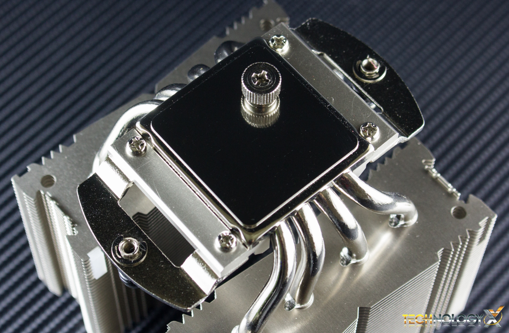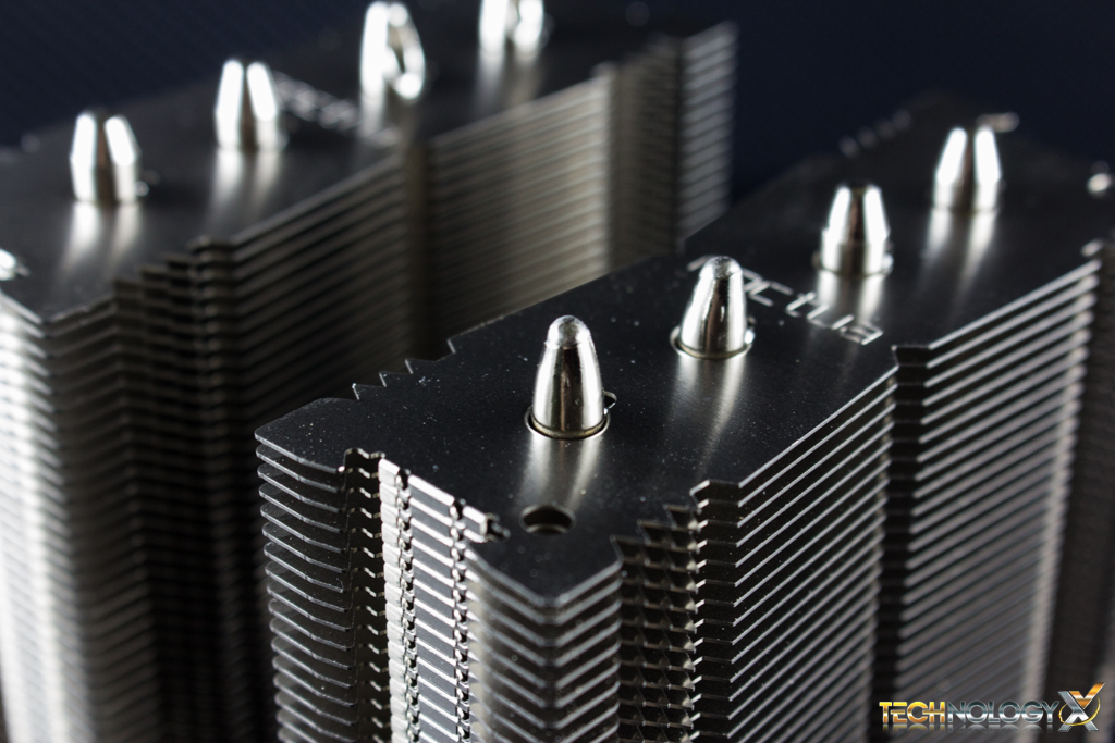 The four 6mm nickel-plated copper heat-pipes which protrude out from the bottom of each of the dual heat-sinks into the base, are spread apart in order to transfer heat more efficiently.