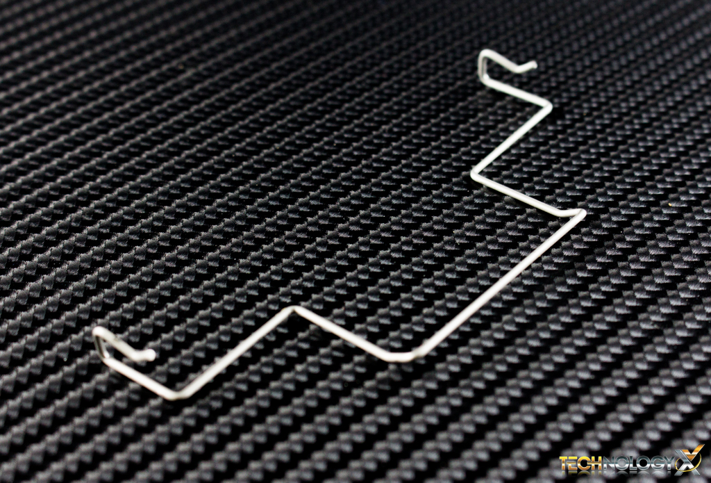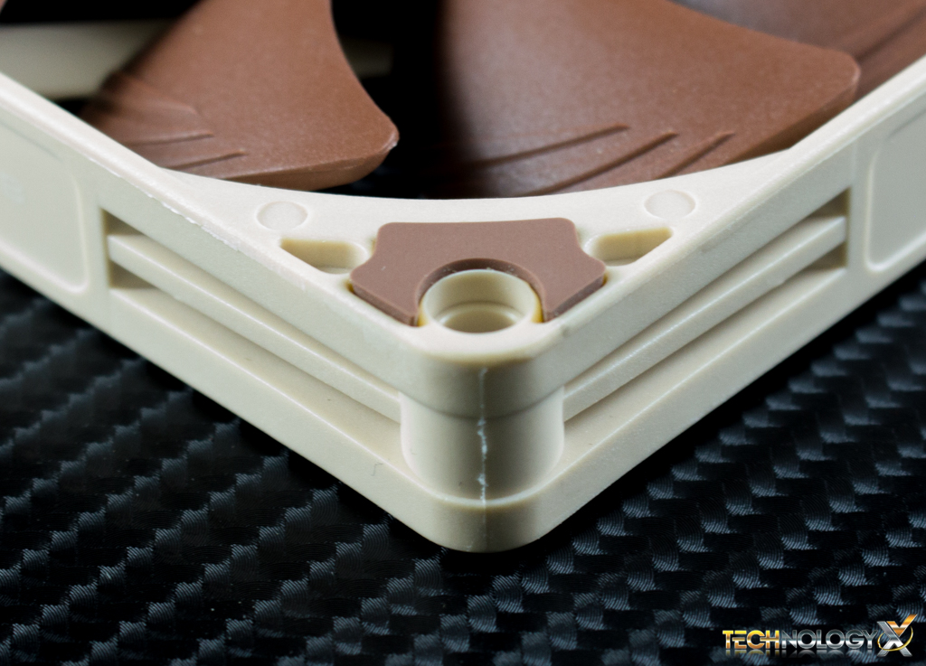 The corners have a small rubber padding on them to help minimize sound due to vibration. The fans power cable features an all-black sleeve, with a dimpled rubber texture. It connects to the heatsink using a pair of wire retention clips, which hook on to the fans mounting holes.