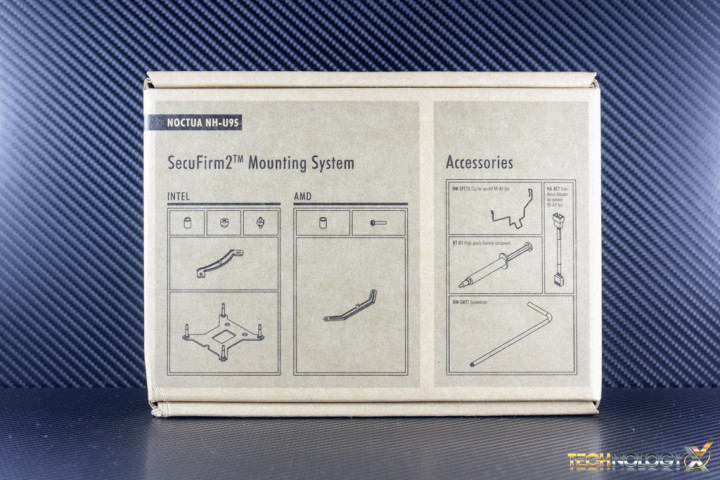 Taking a look at the front of the packaging, we are once again greeted by the classic Noctua color scheme, which they use on all of their packaging. It’s an elegant design, which we can’t take much issue with, except for the lack of a detailed image of the actual cooler, which we’ve mentioned multiple times in the past when reviewing their other products.