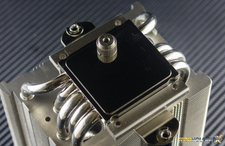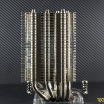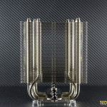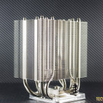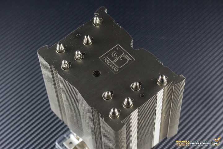 The aforementioned base is made of a nickel-plated copper and features a smooth mirror-finish, and a relatively large surface area which should provide good contact with any modern CPU. At the top of the cooler we’ll see where the five heat-pipes are capped off, as well as a Noctua logo embossed into the center of the heatsink.