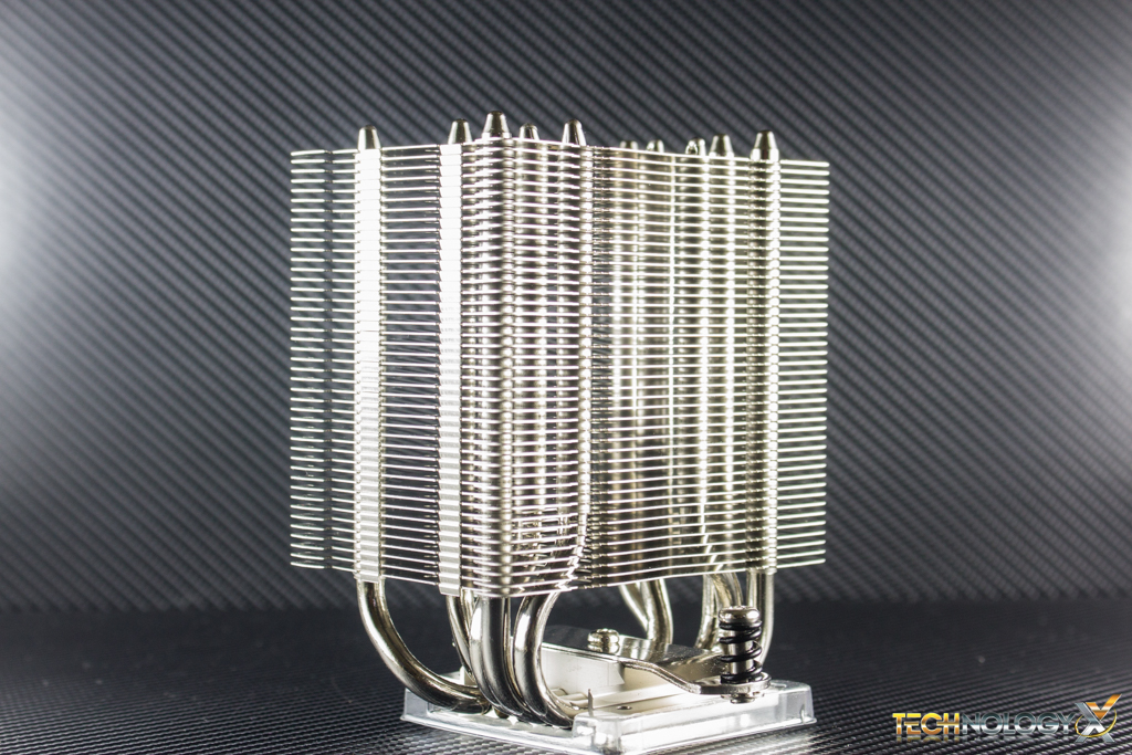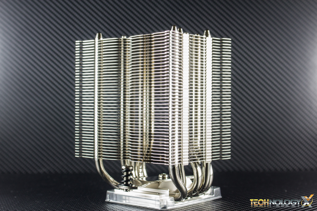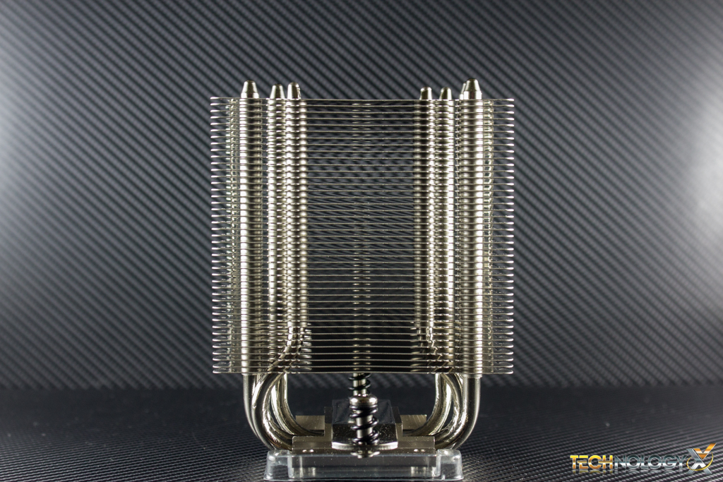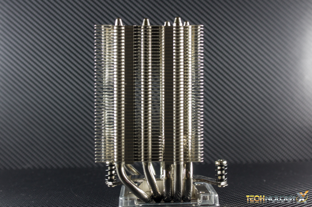 There are five 6mm nickel-plated copper heat-pipes which protrude out from both sides of the bottom of the heatsink and meet a the base.