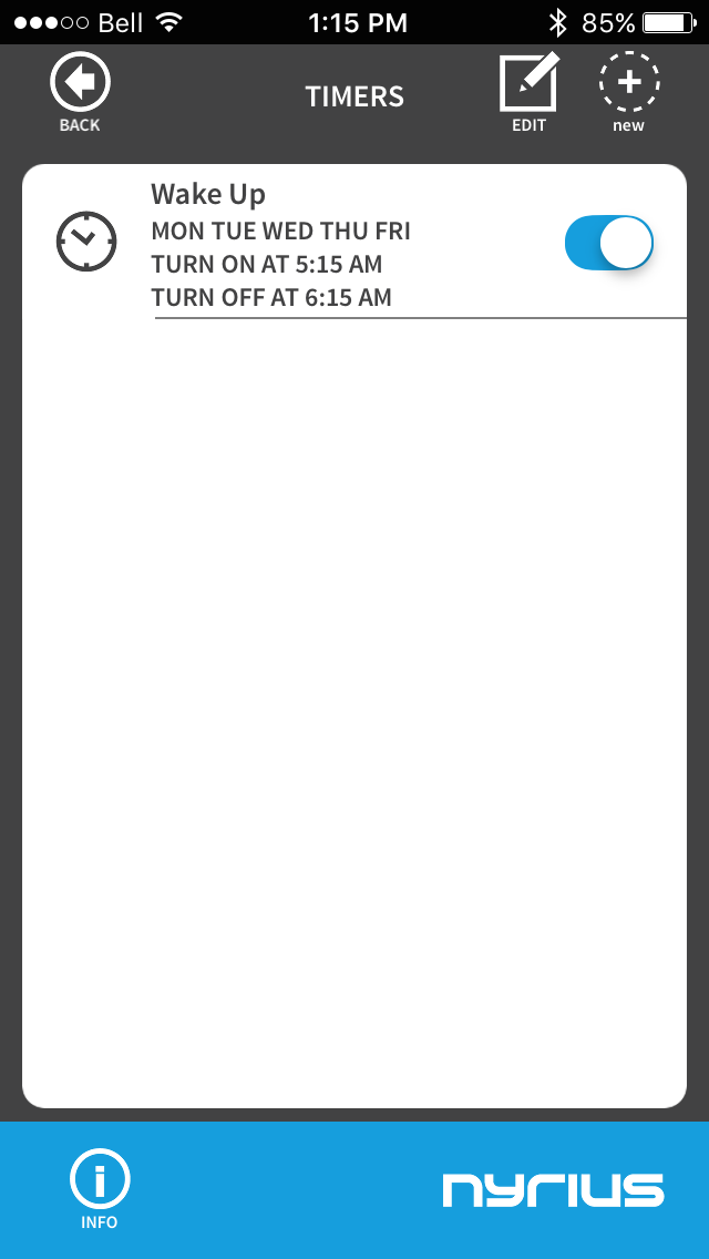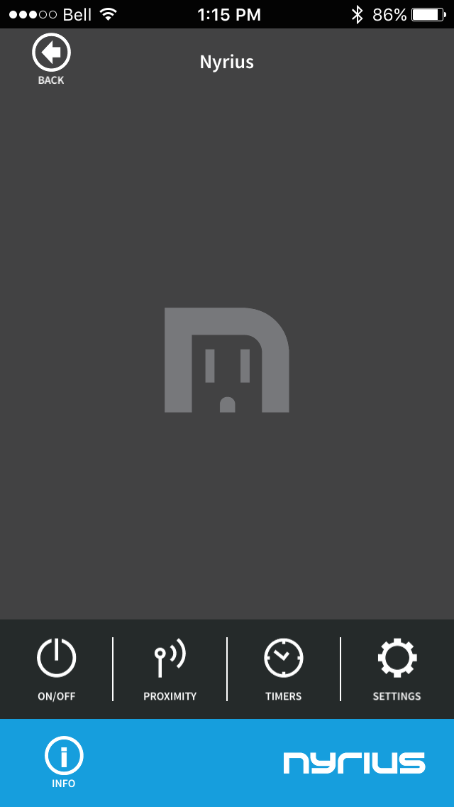 Unlike the smart light bulb before this, the application is set for the larger iPhone display. The first screen allows you to select the outlet you wish to control. On iOS devices you can control three outlets, on Android you can utilize up to seven. Once you have clicked on the outlet, you are then prompted with four options. You can power the object on and off, you can set the object to turn on when near by, you can set a timer for that object so that it will turn on at specific times, or you can enter settings and control the security of that object.