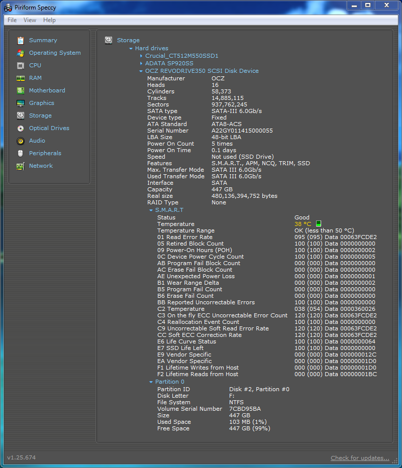 With Speccy we can see that the RevoDrive 350 features the S.M.A.R.T. attribute, which allows for us to monitor the health of the SSD over its lifespan, as well as TRIM. We can also see with the OCZ PCIe SSD that the total usable space, after firmware and over-provisioning, is 447 GB.