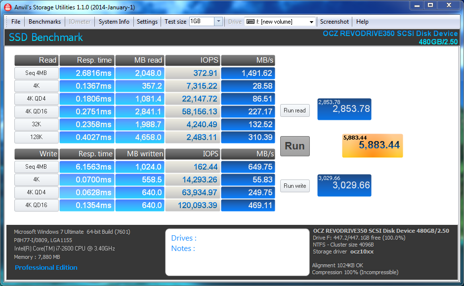 Our all-in-one benchmark tool, Anvil’s Storage Utility, returned read results that are similar to what we have seen previously, but slightly decreased write speeds. The RevoDrive 350 achieved a total score of 5883, an amazing score.