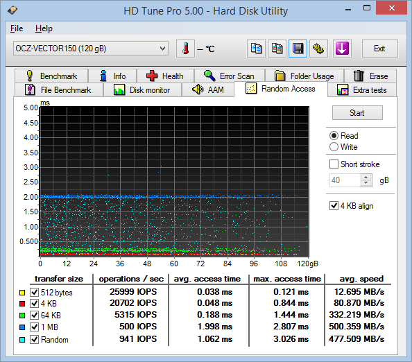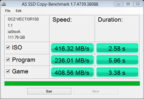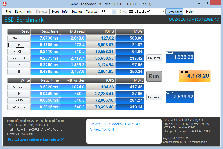 Analyzing the data briefly, the OCZ Vector 150 yields some amazing results. There are a few errors here and there as our system did not play too well with the write speeds of the Vector 150, but in general the performance is top notch for a 120GB SSD, but keep in mind that it is also the lowest offering of the three. The 240GB and 480GB versions will be even more astounding, and probably your best bet in terms of price and performance.