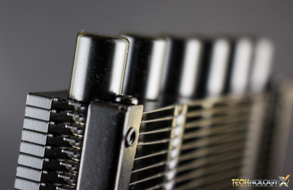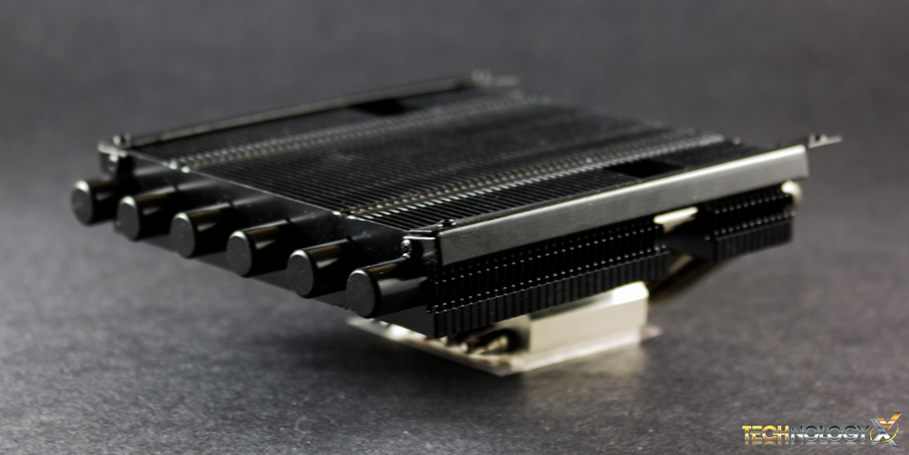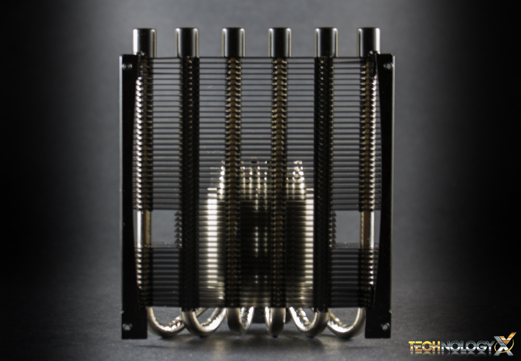 On the other end of the heat-sink we’ll find six nickel-plated copper heat-pipes, which are attached to the base from a single side. The base is also nickel-plated copper, and is completely flat with a mirror finish.