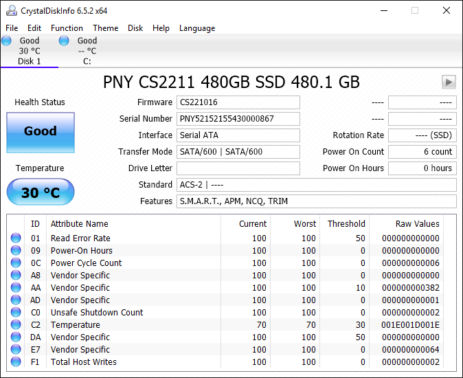 Crystal disk info shows us that the drive has been powered on 6 times, for a total not exceeding a single hour. It also shows us that this drive features SMART attributes and supports trim, but lets check just to be sure.