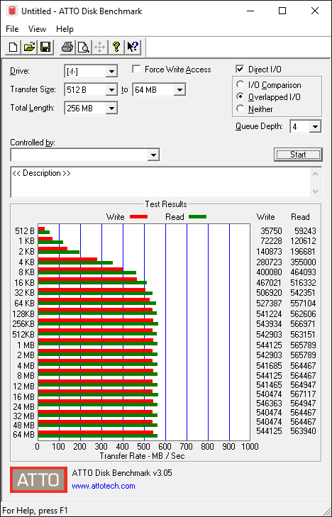 ATTO Disk Benchmark is a relatively easy-to-use benchmark tool, which happens to be the benchmark of choice for many manufacturers. ATTO uses compressible data rather than random data, which results in higher performance and thus, higher benchmark scores. In our testing, we have selected the transfer size to range from 0.5KB to 8192KB, and have set the total length of the test to be 256MB.