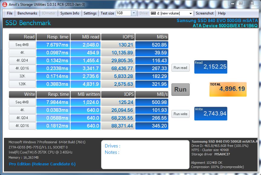 ASU demonstrates that the Samsung 840 EVO mSATA SSD again reads and writes at great speeds, and generates an impressive 4896 total score.