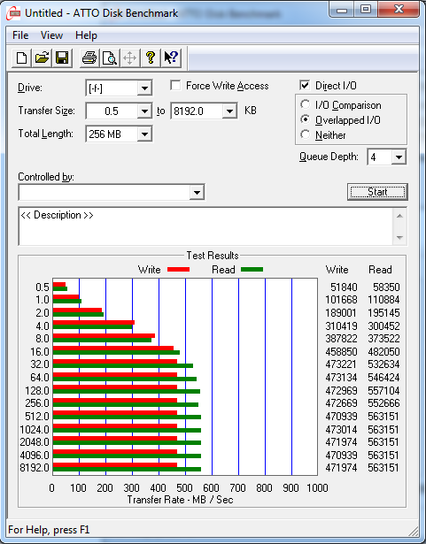 ATTO shows us a high of 563MB/s read and 472MB/s write. These results surpass the listed specifications of 550MB/s read and 470 MB/s write.