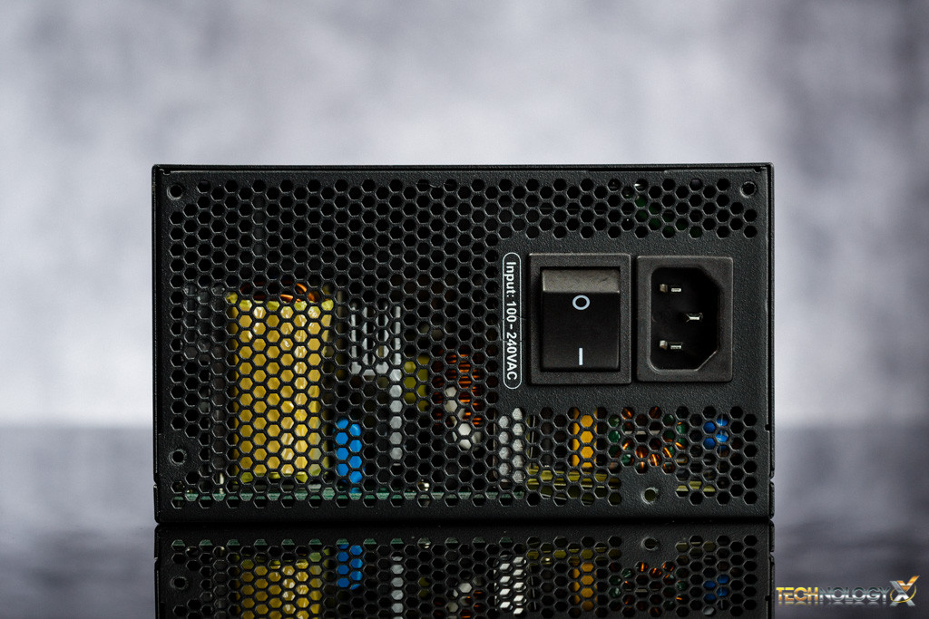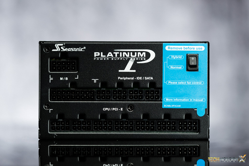 Looking at the connector side we see it has a nice range of connectors plus the beauty of being fully modular. Notice the switch, which allows the fan to operate in two modes, Hybrid and Normal. Hybrid mode provides three different modes which are fanless, silent and cooling modes. This allows automatic fan control based on load and temperature so that the PSU can operate quietly at minimal load and prolongs fan life. Normal mode is as if the fan operates as standard PSU fans. To see more about this operation visit Seasonic.