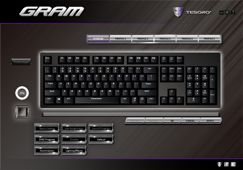 Layouts for peripherals software are usually fairly basic and only differ by aesthetics and any major features. Along the top you’ll see there are six profile tabs. Five which are completely customizable and the first, PCMODE, which is standard and the only things with that you can adjust are lighting.
