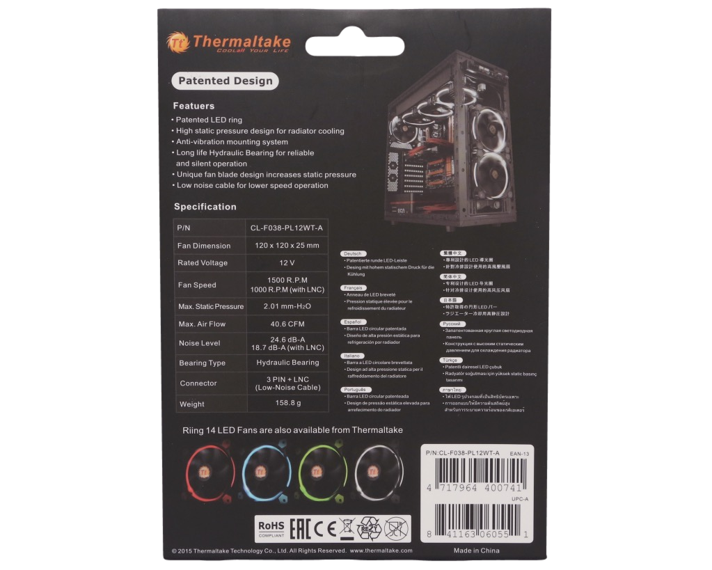 The front of the packaging for the Riing case shows a few details of the case fan. With the display window, it shows the color of the LED built into the fan.