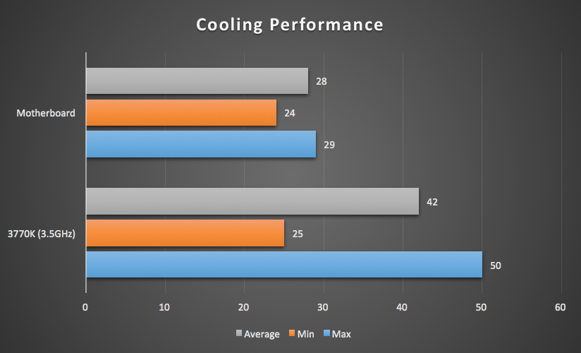 As you can see above, our Asus motherboard had an average temperature of 28C, peaking at 29C. We found that during the stability test, our Riing fans at 1700 RPM, there were no concerns regarding temperatures. Even the CPU only reached a max temperature of 50C. A huge thumbs up in our books!