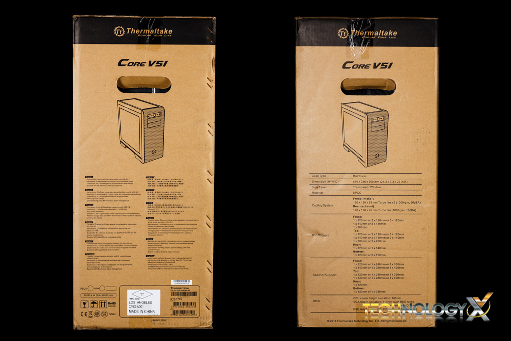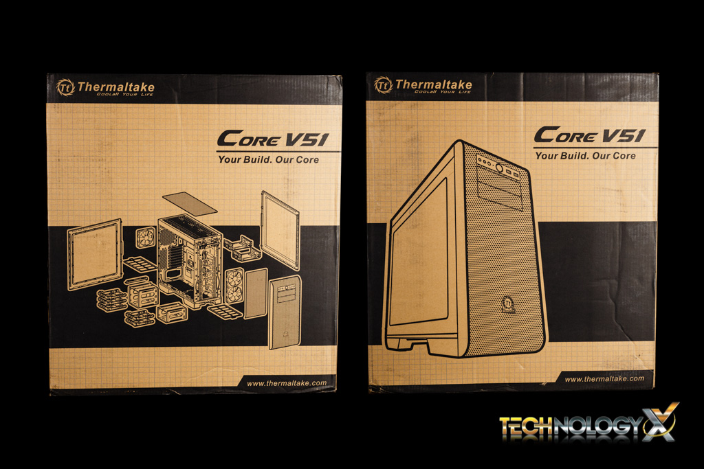 The Thermaltake Core V51 arrived at my door in its standard packaging, a double-walled corrugated cardboard box. On the box is a list of the case specifications and an exploded view of the case showing some of its features and modularity.