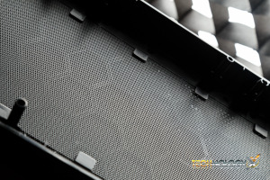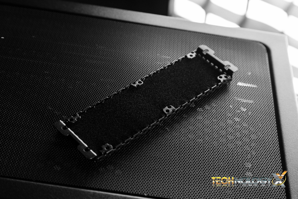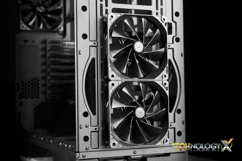 Underneath the front panel there are two pre-installed 120mm intake fans. All three of the pre-installed fans are rated at 1000rpm, 16dBA. The front faceplate is also covered in a non-removable dust filter screen.