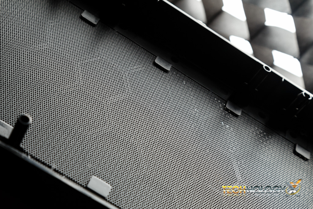 The front faceplate has hexagonal holes in it to allow for air to pass through and covered in a metal mesh for styling.