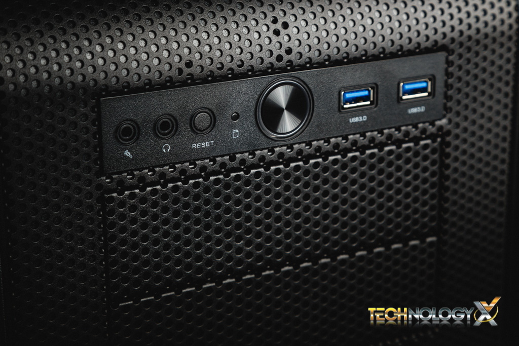 The front has two 5.25″ bays and above them it has a headphone and a microphone jack, reset button, HDD activity light, power button, and two USB 3.0 ports. The 5.25″ bay covers also have a foam insert in them to filter out dust.