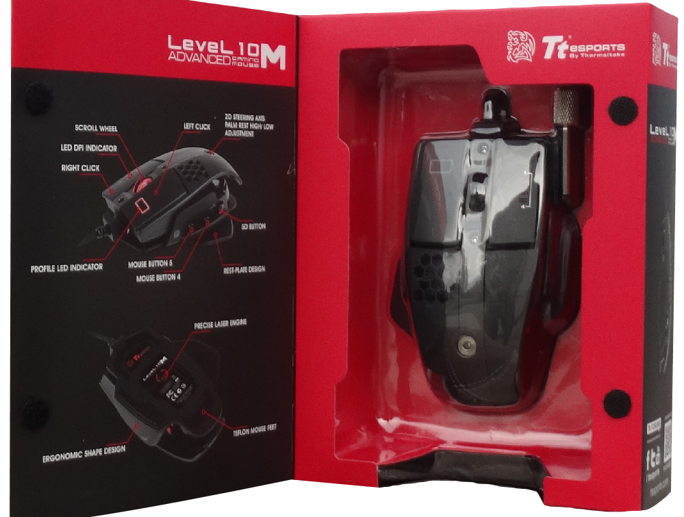 Level 10M’s packaging outlines everything you need to know about the mouse before you buy it. Big bold features on the front outlining the amazement you’ll find once you plug it in. You get your first look at the mouse as well on the front. The front cover opens story book where you can get your first hands on feel of the Level 10M. A little wrist nook in the bottom allows you to feel the size of the mouse, there is a plastic cover on it but it’s enough to tell if you want to give it a go. You’ll also see along the inside of the package door a guide which outlines every button and some of the features of the 10M again.
