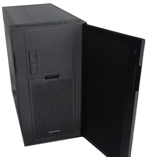 A first look at the F31 shows us a solid black colour. The front panel is a door that opens to expose the two 5.25” drive bay doors and the front fan’s dust cover. While on the topic of dust covers, the F31 is full of them. Thermaltake has really taken an effort into ensuring your computer stays clean and running smooth. The panel door itself has a padded sound dampener, sound “suppressor” some may say, bringing its name into the picture.