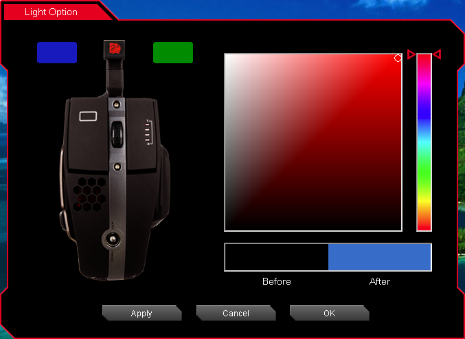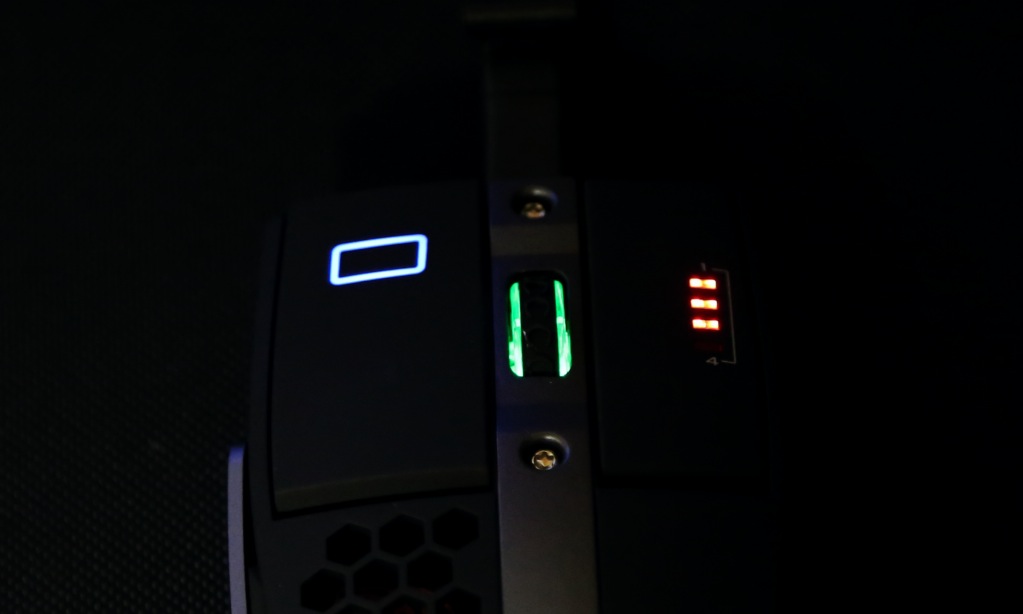 On top of having some customizable illumination, the hybrid gaming mouse also features four red LED’s found at the top right of the right click button which indicate the performance level you have set within the interface. As you can see from the example below, we have set the hybrid mouse with a blue LED on the left click button, green LED for the scroll wheel, and have the mouse set to the third performance level.