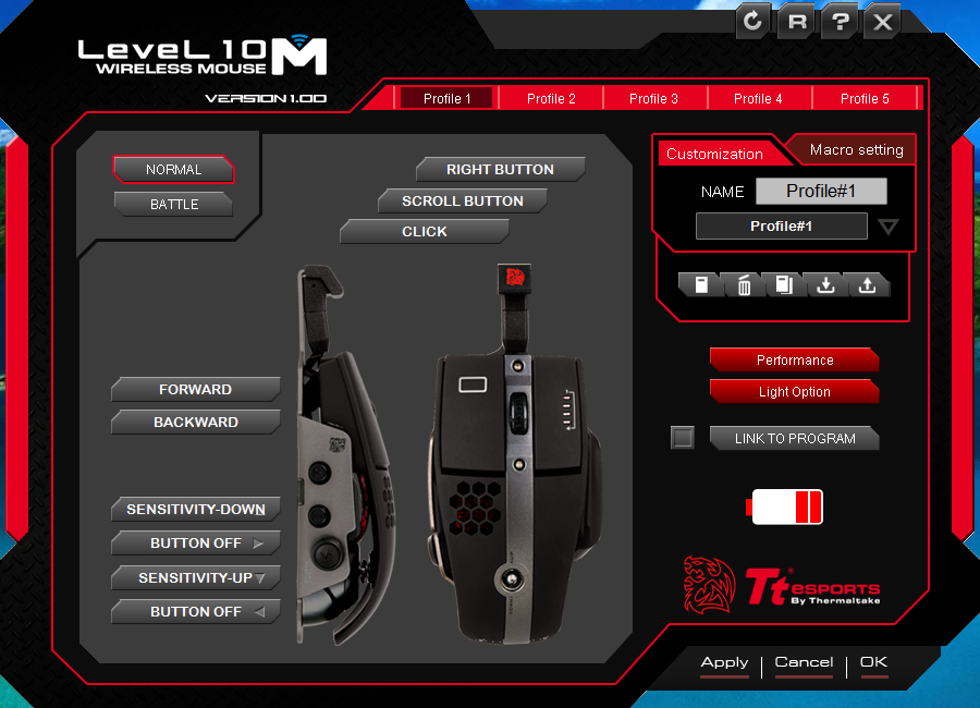 Similar to as we saw with the Thermaltake Tt eSPORTS Theron Infrared Gaming mouse, the Level 10 Hybrid mouse also features a graphical interface that can be quickly and easily installed onto your gaming rig. The interface let’s you customize your gaming mouse experience by altering the five different profiles; setting different macro’s for your left side switches, as well as customizing the mouse’s performance and light settings. You can even see the battery level remaining in your rechargeable hybrid gaming mouse.