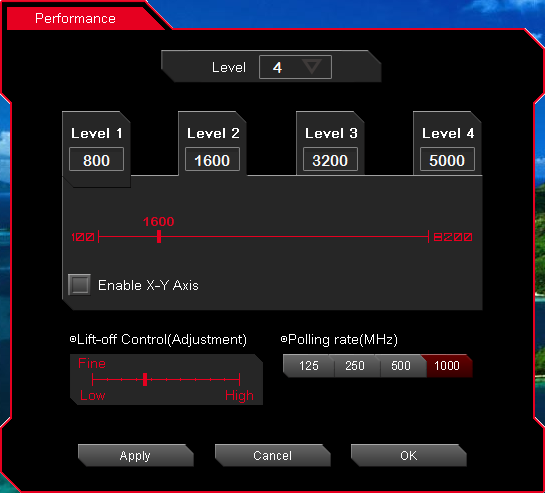 In the performance tab, you can adjust the individual DPI levels, corresponding a different DPI setting than set by default. You can also adjust the polling rate, and lift-off control.