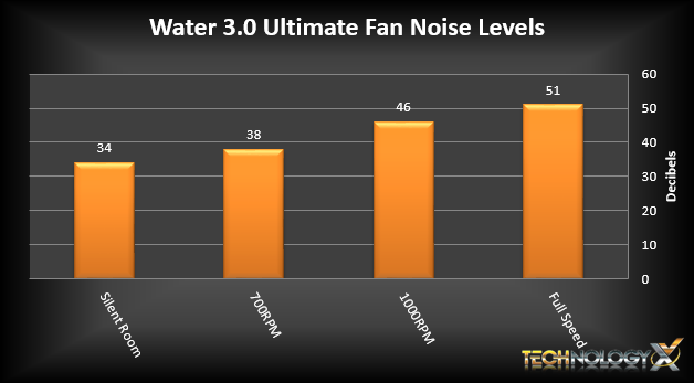 We tested the cooler’s noise output by using a sound meter placed near the system’s case with the side-panel closed, 3 feet away. We tested the cooler at both full speed and an idle speed of 1000 RPM as well as tested for when the fans seemed to be quiet or near silent. We also tested the sound of our environment with the system shut off to illustrate the difference, which averaged 34 dB.