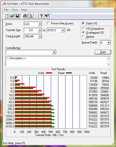 ATTO Disk Benchmark is perhaps one of the oldest benchmarks going and is definitely the main staple for manufacturer performance specifications. ATTO uses RAW or compressible data and, for our benchmarks, we use a set length of 256mb and test both the read and write performance of various transfer sizes ranging from 0.5 to 8192kb. Manufacturers prefer this method of testing as it deals with raw (compressible) data rather than random (includes incompressible data) which, although more realistic, results in lower performance results.