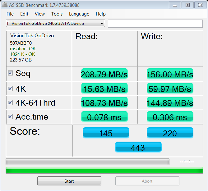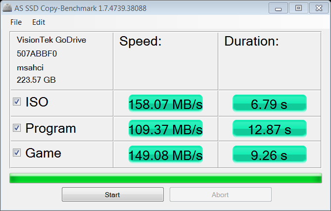 As we can see above, the VisionTek Go Drive has read and write speeds that are similar to that of the scores previously seen with Crystal Disk Mark.