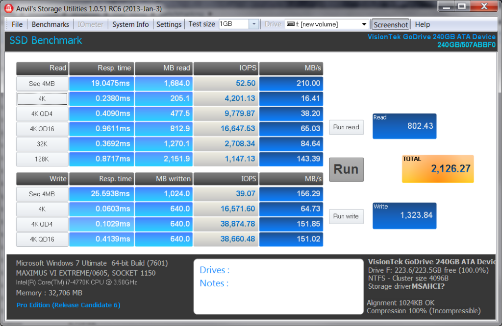 Anvil Storage Utilities is essentially an all-in-one tool for all of your SSD benchmarking needs. Anvil can be used for basic consumer testing, as well as endurance testing and threaded I/O read, write and mixed tests. It displays data regarding the SSD, and even about your system. We also ran Anvil Storage Utilities twice, the first benchmark represents compressible data.