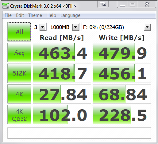 Crystal Disk Benchmark is visually straightforward, and is used for measuring the speeds at which your storage device reads and writes in both compressible (oFill/1Fill) and random, mostly incompressible, data. Random data is more consistent with everyday use of a computer, such as transferring videos, pictures and music.