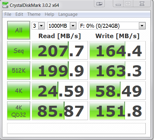Meanwhile, the random data results displayed read speeds of 207 MB/s and write speeds of 164 MB/s.