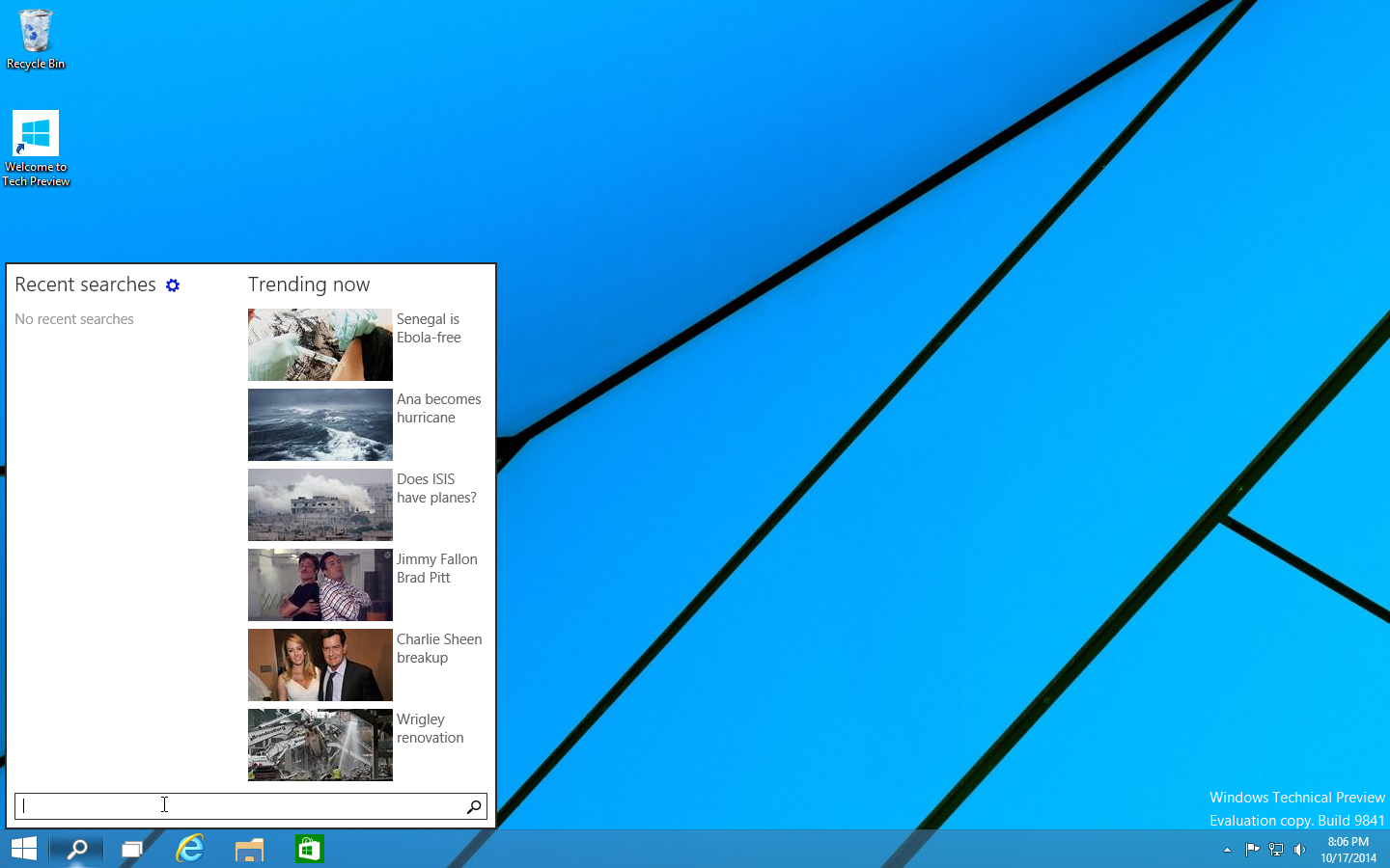 Pressing the aforementioned button opens up the dedicated Search window that consists of nothing but search bar as well as a list of the top trending search results provided by Bing. Actually searching for something will bring you a mix of Bing search results and local results like applications or files that match your search query.