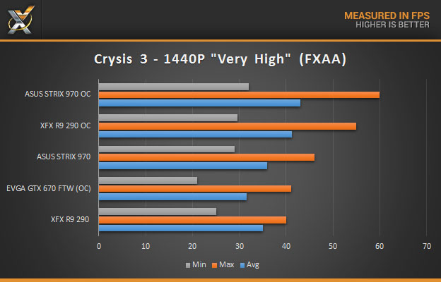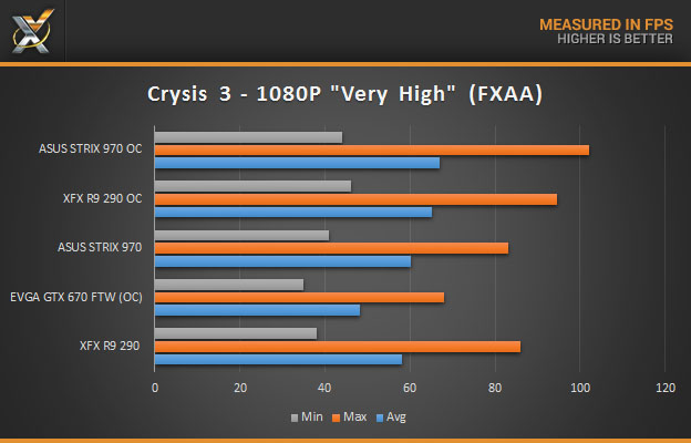 Taking a look at Crysis 3 we see the STRIX 970 taking a solid lead over the XFX R9 290 but frankly this card is performing very well for its lower price point.
