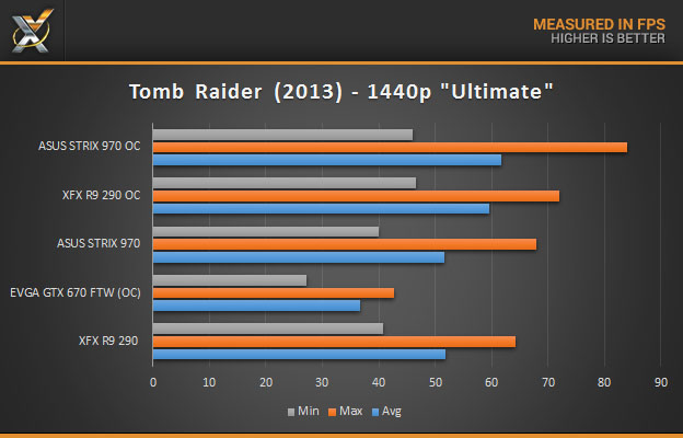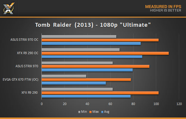 Tomb Raider shows us that the 290 gets ahead of the 970, something that I had not expected the 970 has slightly better minimum FPS and average FPS at stock but just cant keep up once overclocked.