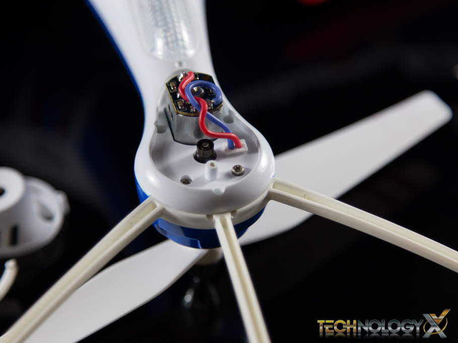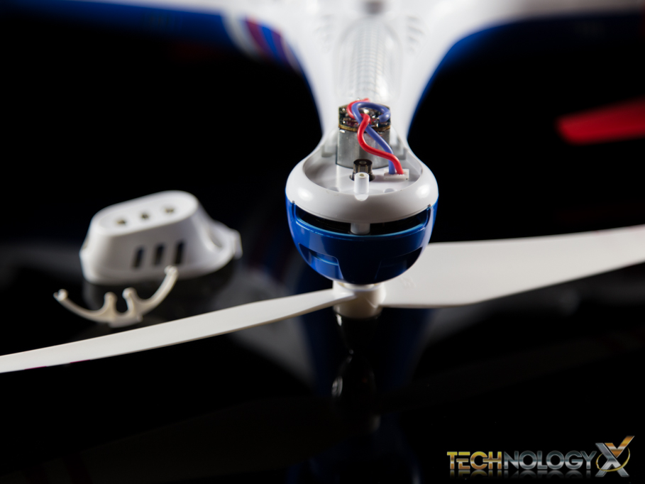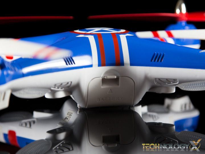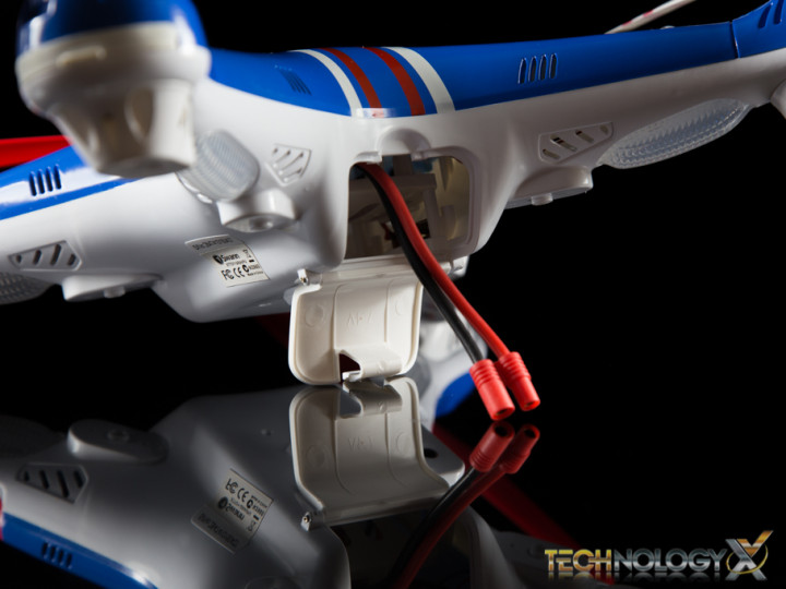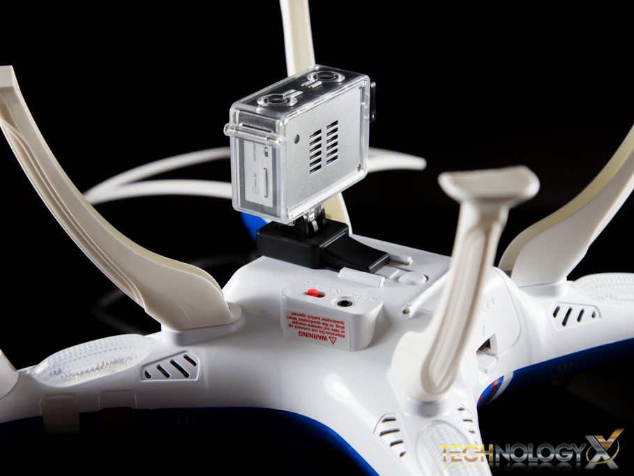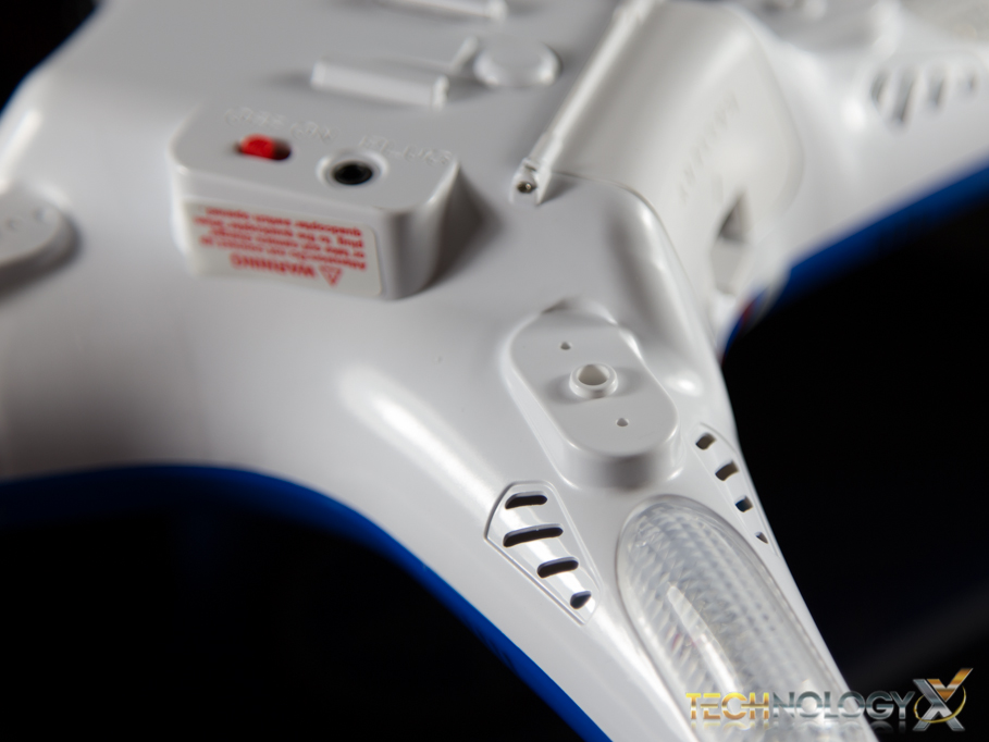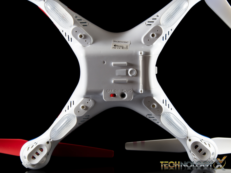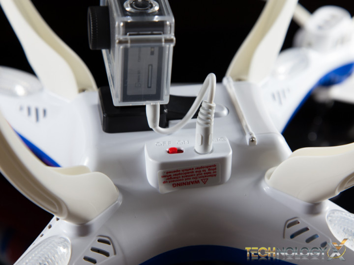 The bottom of the Xtreem Gravity Pursuit has four mounting locations for the landing gear, a slide-in clipping system for the HD Camera mount, your on/off power switch and the 3.5mm plug for the HD Camera’s controls.