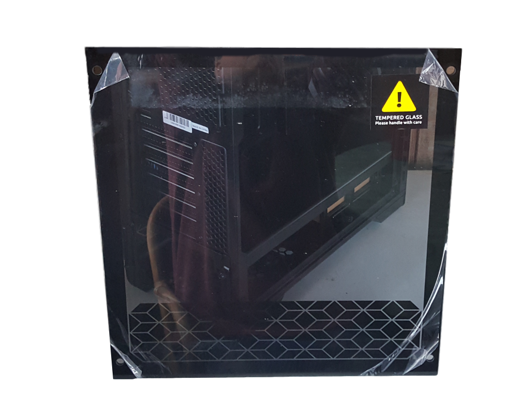 The right side panel is a mirror image of the left, being entirely slightly darkened tempered glass, again held in place by four identical knurled thumb screws.