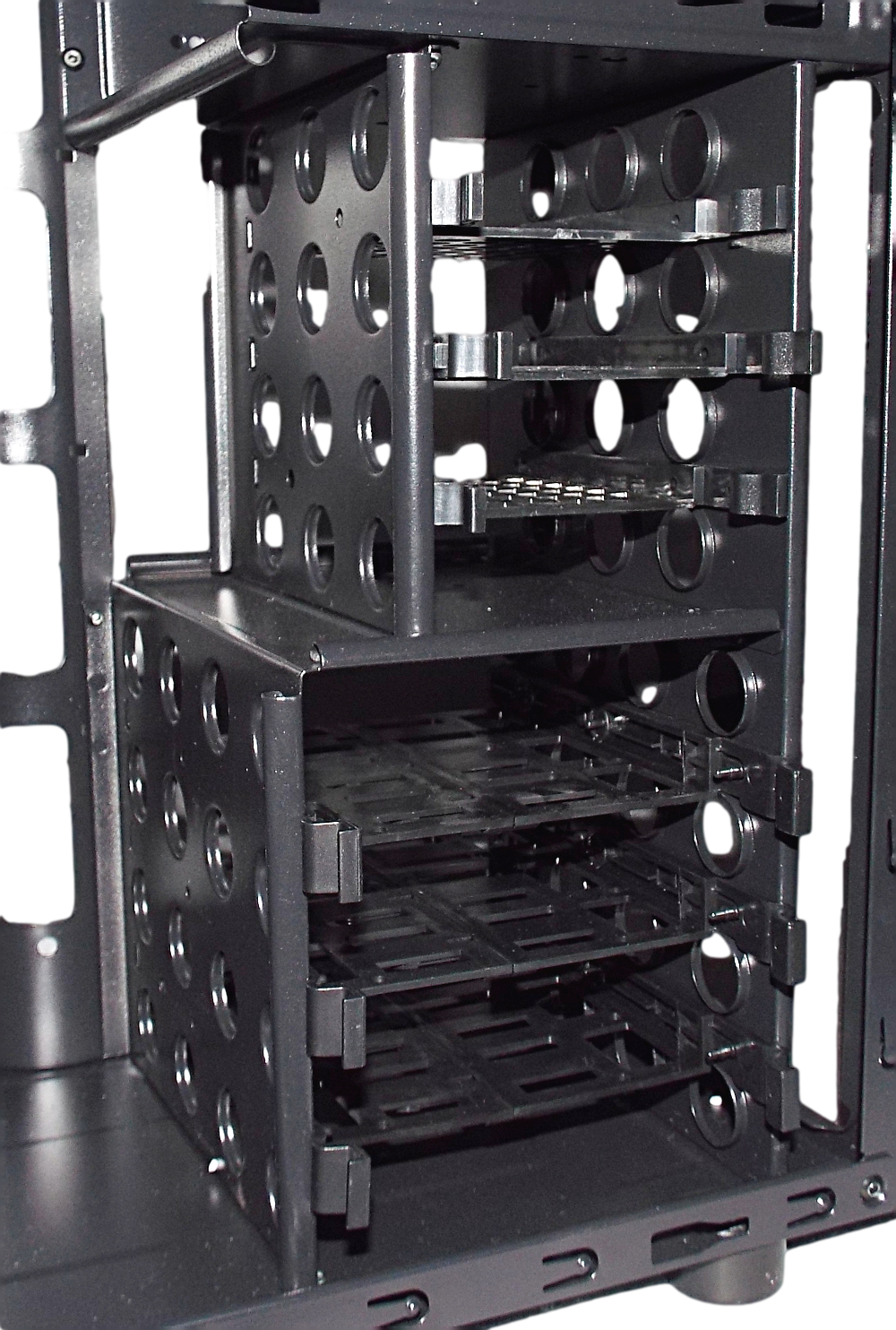 Next we see the HDD/SSD drive cages. The upper cage can house up to three 2.5″ HDDS or SSDs, while the lower cage can house up to three 3.5″ HDDs.