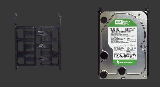 Note the “seam” down the center of the 3.5″ drive tray in the above image. This tray features a very clever tool-less method to mount a 3.5″ HDD. Grasping the sides of the tray and pulling outward (left/right) expands the tray to its “open” position, as seen in the next image below left. Lay your 3.5″ HDD into the tray and align the screw holes in the sides with the pins on the side rails of the drive tray, then squeeze the sides back together to lock the HDD into place. The right-hand image below shows a 3.5″ HDD latched securely into position.