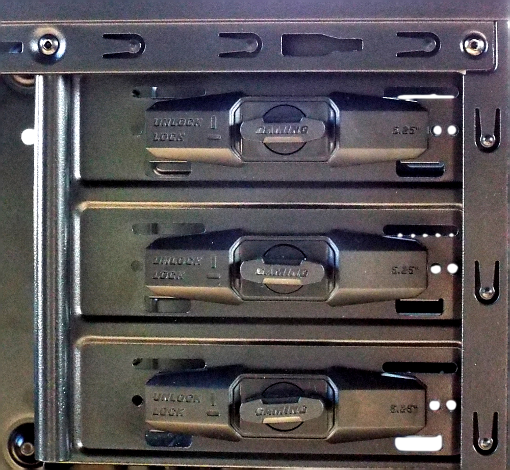 In the next image, we see the upper 5.25″ drive bay tool-less latching mechanisms. Cougar has come up with a very simple, yet effective method for tool-lessly mounting your optical drive or other upper drive bay device (such as a fan controller or card reader). Merely rotate the knob with the word “gaming” molded into it from the horizontal position to the vertical position (90 degrees), and the latch can be removed. Slide your optical drive or other device into position with the mounting holes aligned with the holes in the drive bay, align the pins on the back of the latch with the corresponding holes, and rotate the knob from the vertical back to the horizontal (90 degrees). Voila! Your optical drive is securely latched into place. Standard screw holes are present on both sides of the drive bays if you choose to secure your optical drive more permanently.