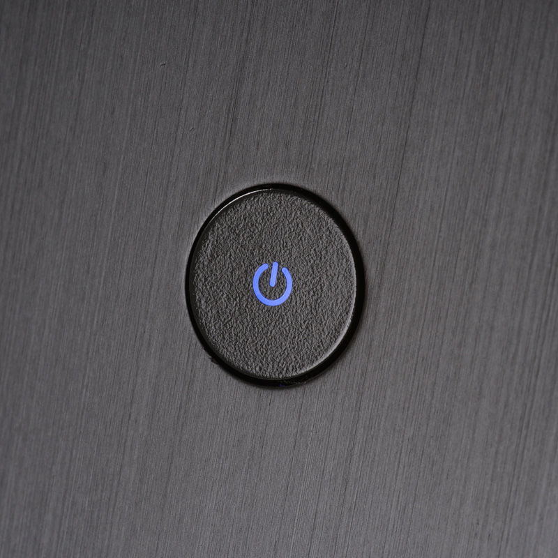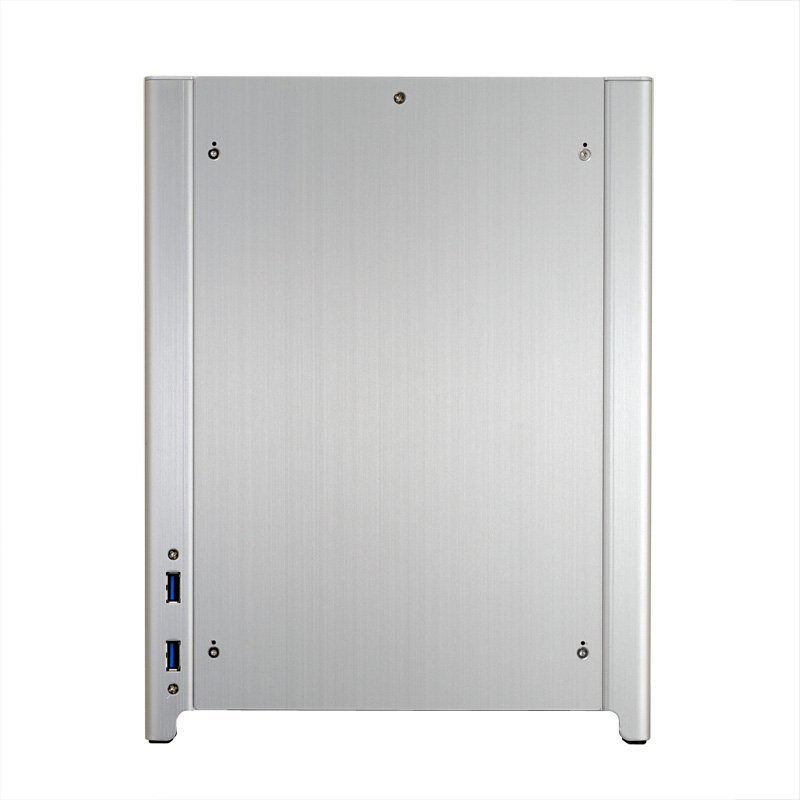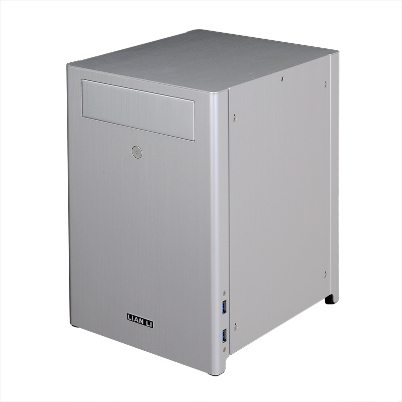 The front of the PC-Q27 features the elegant brushed aluminum look that Lian Li is known for. The only non-aluminum part of the front is the dual LED illuminated power button that glows blue when on and red while loading. The I/O panel with two USB 3.0 ports is located on the right side of the front of the chassis so not to interrupt the elegant aesthetics.