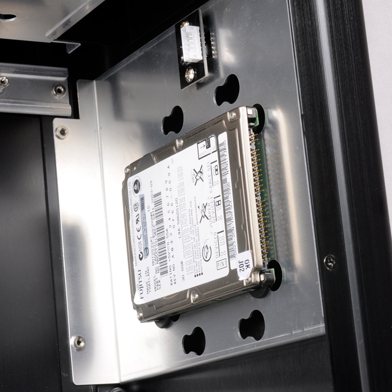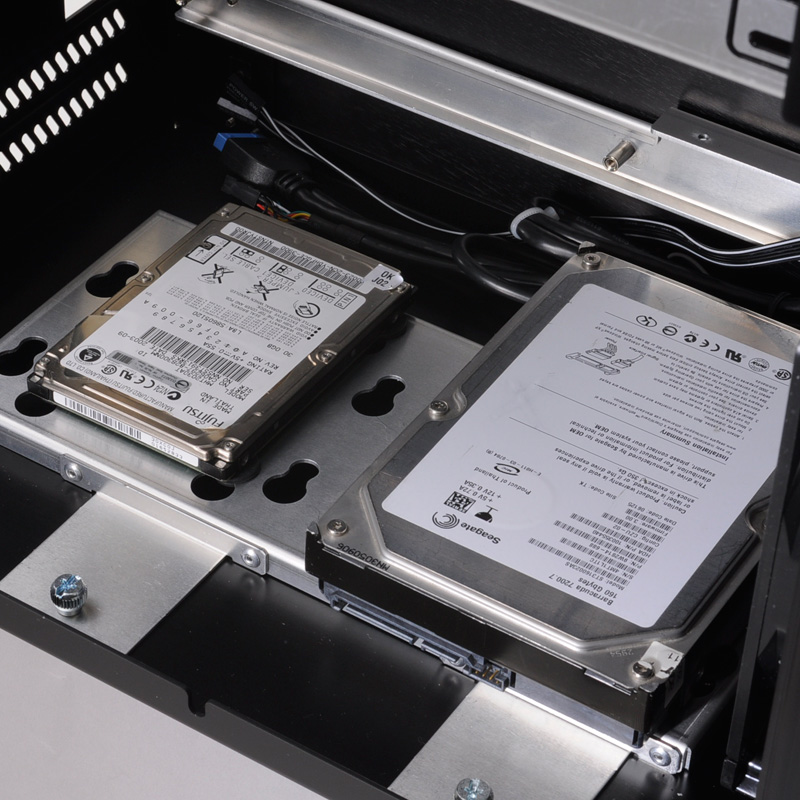 Up to three 3.5” hard drives can fit inside the PC-Q27 with one of the 3.5” drives using the 5.25” drive bay space. For builders wanting to take advantage of the high speeds of solid state drives (SSDs), a single 2.5” drive can be installed on the bottom of the chassis. One more SSD can be installed in place of a 3.5” drive on the front HDD cage.