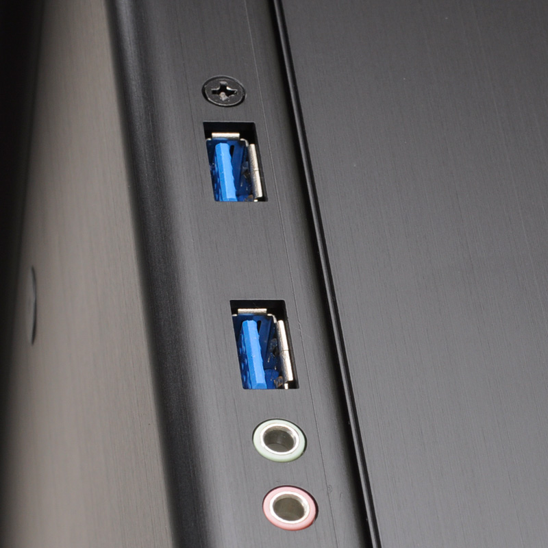 Also, similar to the PC-Q27, the front of the PC-Q28 features the elegant brushed aluminum look that Lian Li is known for, with a dual LED illuminated power button. Two USB 3.0 ports and HD audio connections are located on the right side of the front of the chassis.