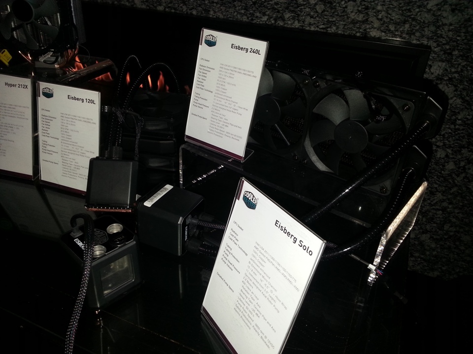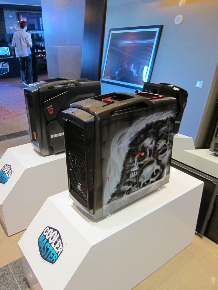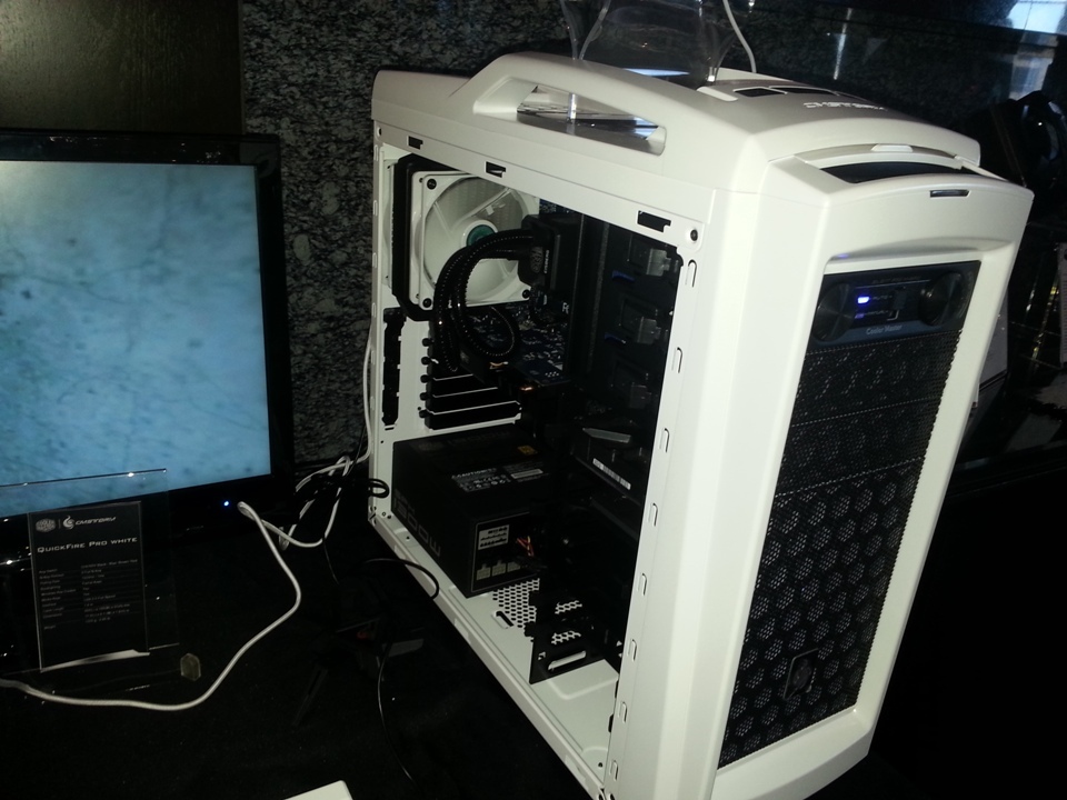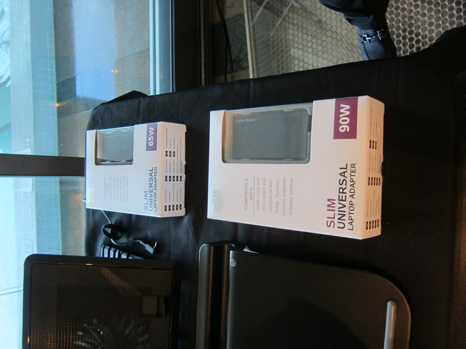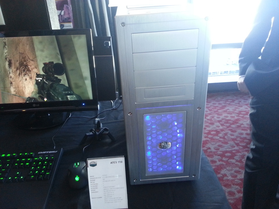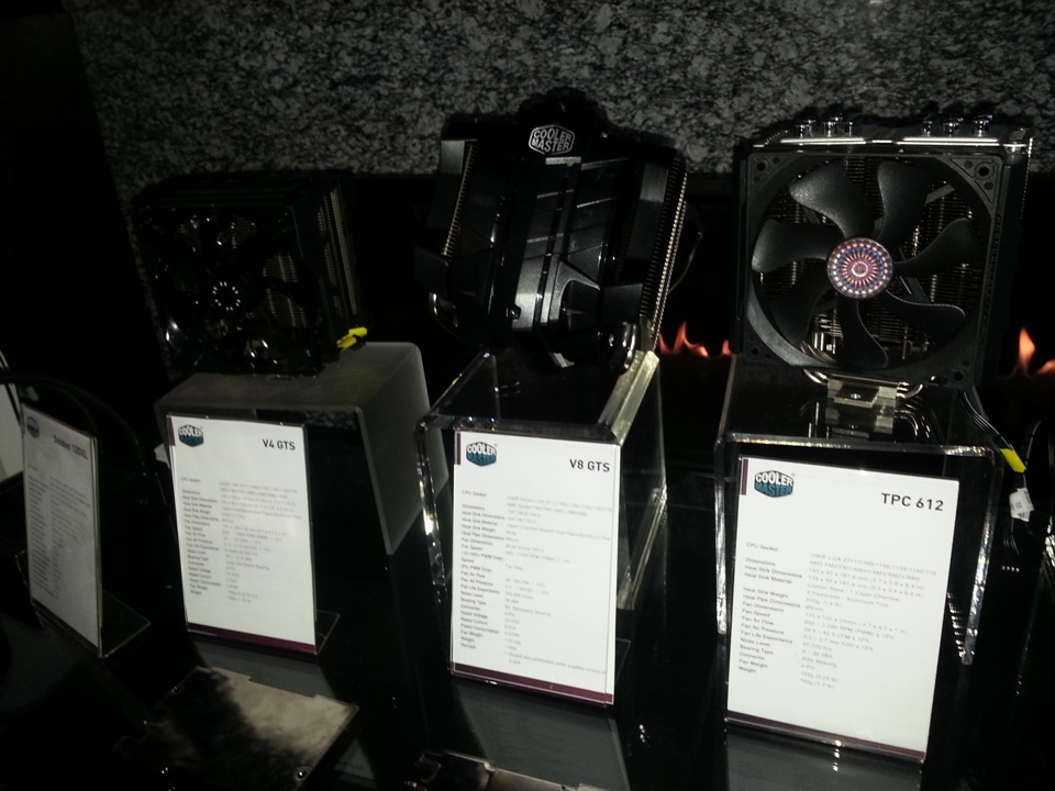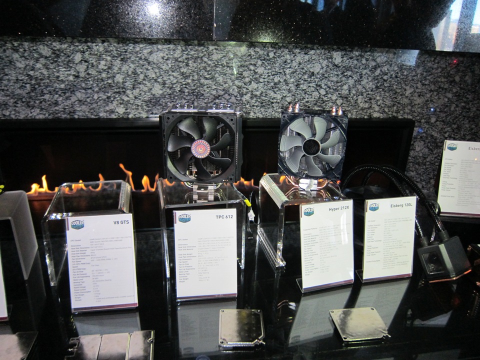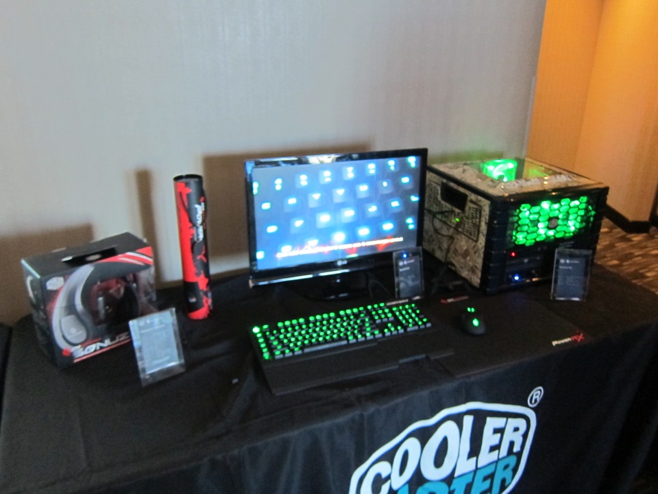 Cooler Master may not have a booth at CES 2013, but they sure have a solid presence nonetheless. I met with the company earlier today in their well-equipped suite and was awed by the layout of their showcase, which was neatly organized into three categories. The first one I visited was the Cooler Master Storm gaming area: Great (and funny) first impression, but it does not stop there. Cooler Master is pumping out some great ideas in their Storm line, such as removable aluminum panels on keyboards, mice, and headsets for eSports-type branding. If you are familiar with arcade sticks, these peripherals follow the same customization and modification - certainly more aesthetically pleasing than smacking a sticker on the side of a headset speaker. There is just way too much stuff to show, but what really caught my eyes is the Cooler Master green-switched keyboard called the "Storm Trigger Green". The Cherry MX green switches are brand new and exclusively available to Cooler Master in North America. The typing experience is absolutely amazing. Think of the greens as a mix between the blues, browns, and reds: tactile feedback, low noise output, and a very low actuation point. To sum it up in one word: brilliant. The home and mobile convenience category is definitely what Cooler Master is targeting heavily. They featured a plethora of stands, device docks, tablet cases, and universal adapters. One of the two products that really captured my attention included pillow-styled cooling pads: The second is a table...yup, a table. Not just any table mind you. It doubles as a stand for your laptop or tablet, and the stand can be removed and repositioned in a variety of ways. It is something I never knew I wanted so badly; such a great futuristic concept, except realized. Cooler Master is still working on the design, as they want to add a cup holder in the empty space clear of ports, yet it still looks fabulous in its current state. Finally getting to the third area of desktops and coolers, I saw a lot of budget-friendly, small form-factor yet fully-featured chassis and heatsinks, as well as faster fans and powerful PSU's. Personally I have never seen a case utilize the sides for radiator installation and I was not expecting it to be capable, nay, possible at these sizes: The new CPU heatsinks have been fitted with vapour-chamber cooling, a method used by many GPU production companies, and yes it is present refresh of the extremely popular Hyper 212+: the Hyper 212X. Simply put, vapour-chamber cooling works in conjunction with normal copper-heatpipe cooling to keep your CPU running at chilly temperatures. Again, Cooler Master is completely loaded and I have gone over just a couple of their products. Make sure to check out the gallery below to preview all of Cooler Master's present and future offerings.