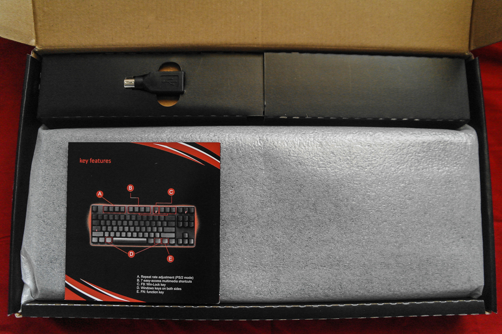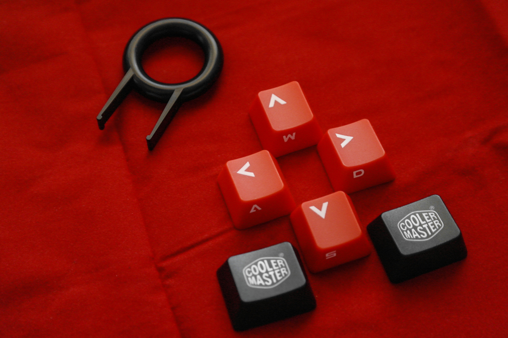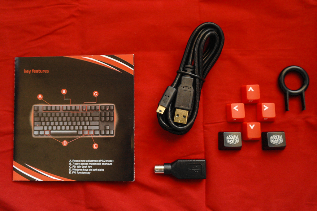 Once opened, contents include the Stealth itself, a quick-start guide, a braided gold-plated microUSB to USB data cable, a USB to PS/2 conversion adapter, four extra red WASD/arrow keys + two “Cooler Master” branded Windows keys, and a key-puller to replace individual keys, as well as for easier keyboard maintenance: