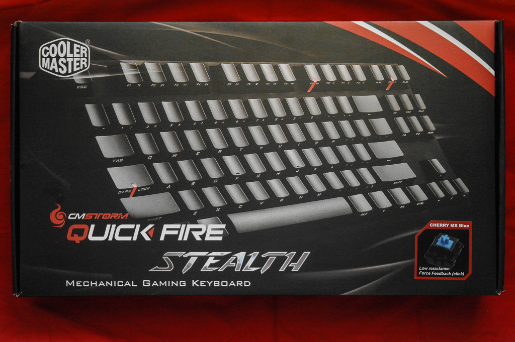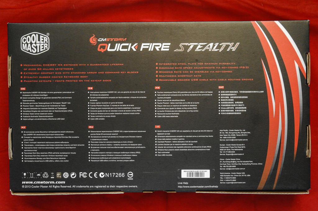 As customary with essentially every other Cooler Master Storm product, the QuickFire Stealth comes in a black and red-schemed box. The front shows off the keyboard and Cherry MX switch colour, while the back has contact information in various languages: